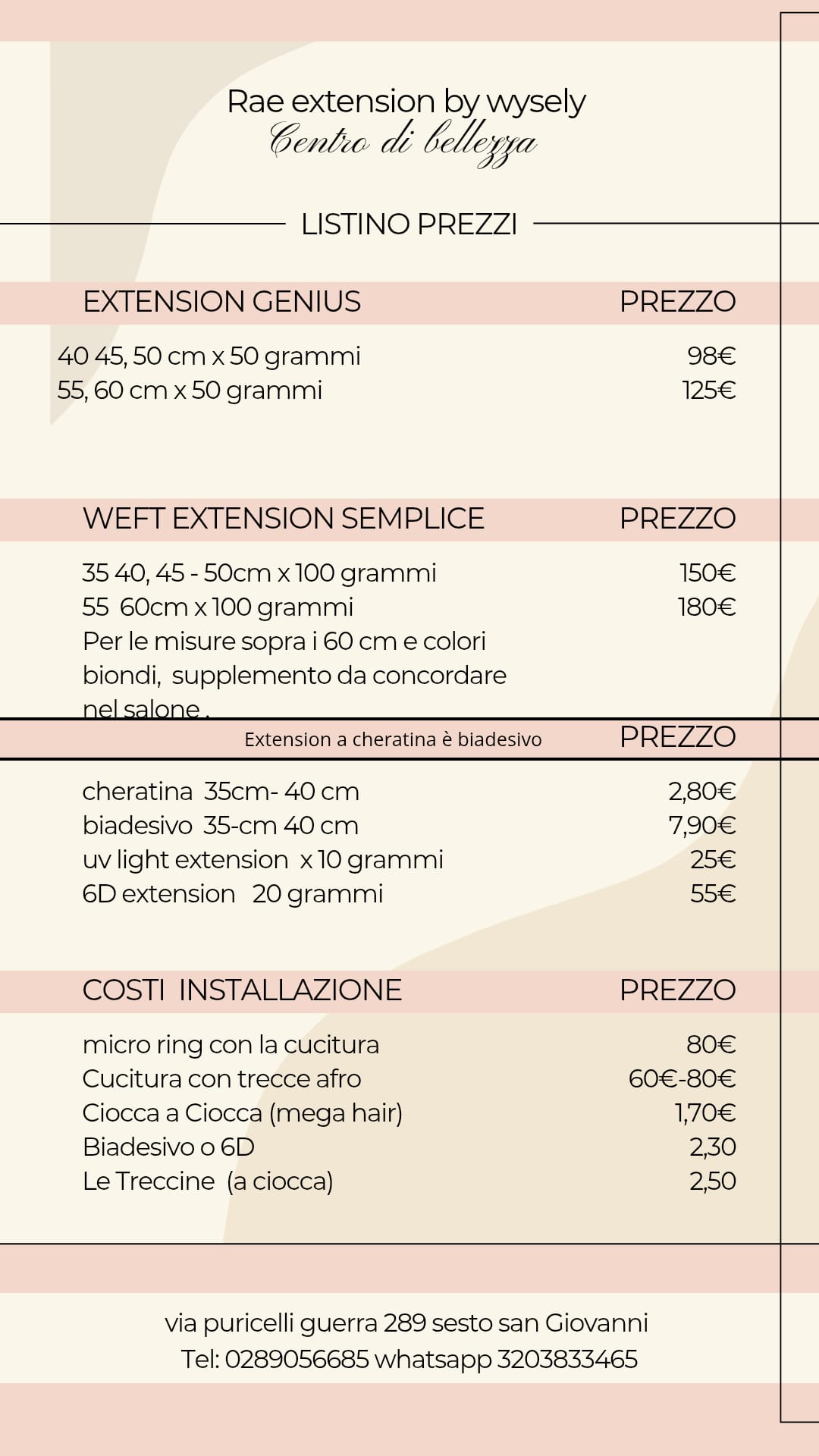 Servizio | Prezzo (in euro) Extension capelli | Da 70 a 170